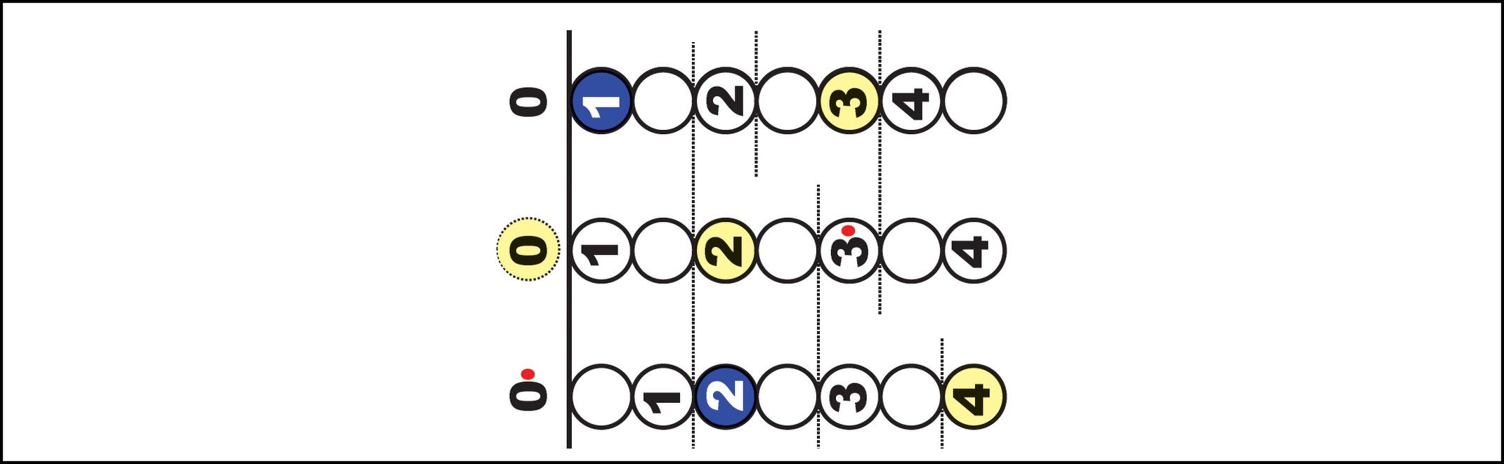Now, when we start the pattern on the 2d finger, the half-step moves one more circle down, so it’s between open and 1st finger, with whole-steps (or a finger’s width) after the 1st, 2d, and 3d fingers.