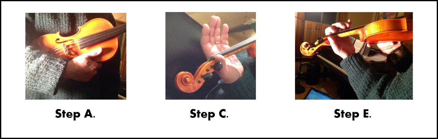 A. Hold the violin like a guitar with your right hand, the back of the fiddle against your belly. Your right hand, all by itself, should be able to swivel the violin up to your collarbone, to playing position. Try it a few times; this is the right hand’s job!